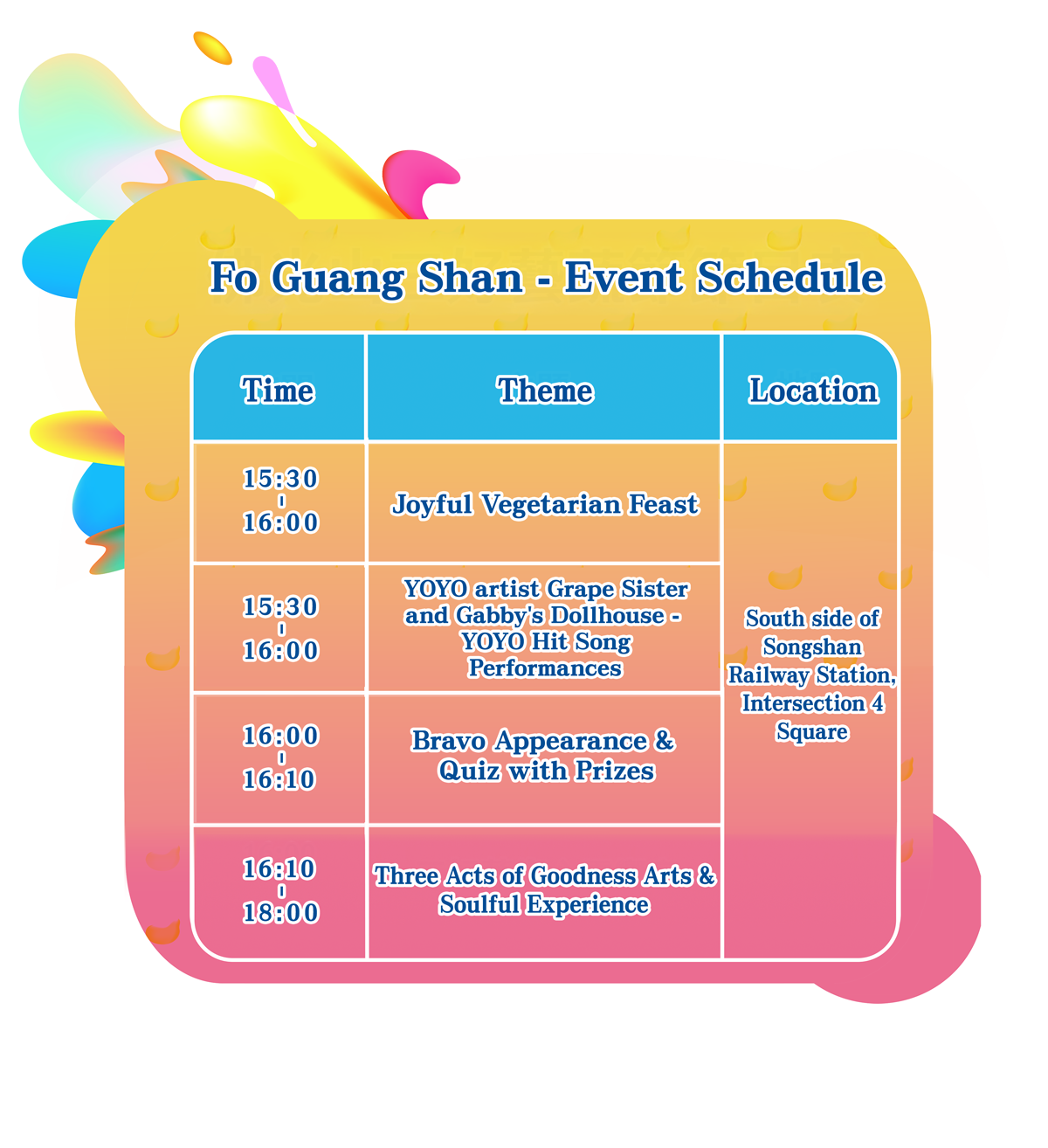 YOYO artist Grape Sister and mascot Gabby's Dollhouse will bring lively singing and dancing performances, while Fo Guang Shan will present a variety of cultural shows.