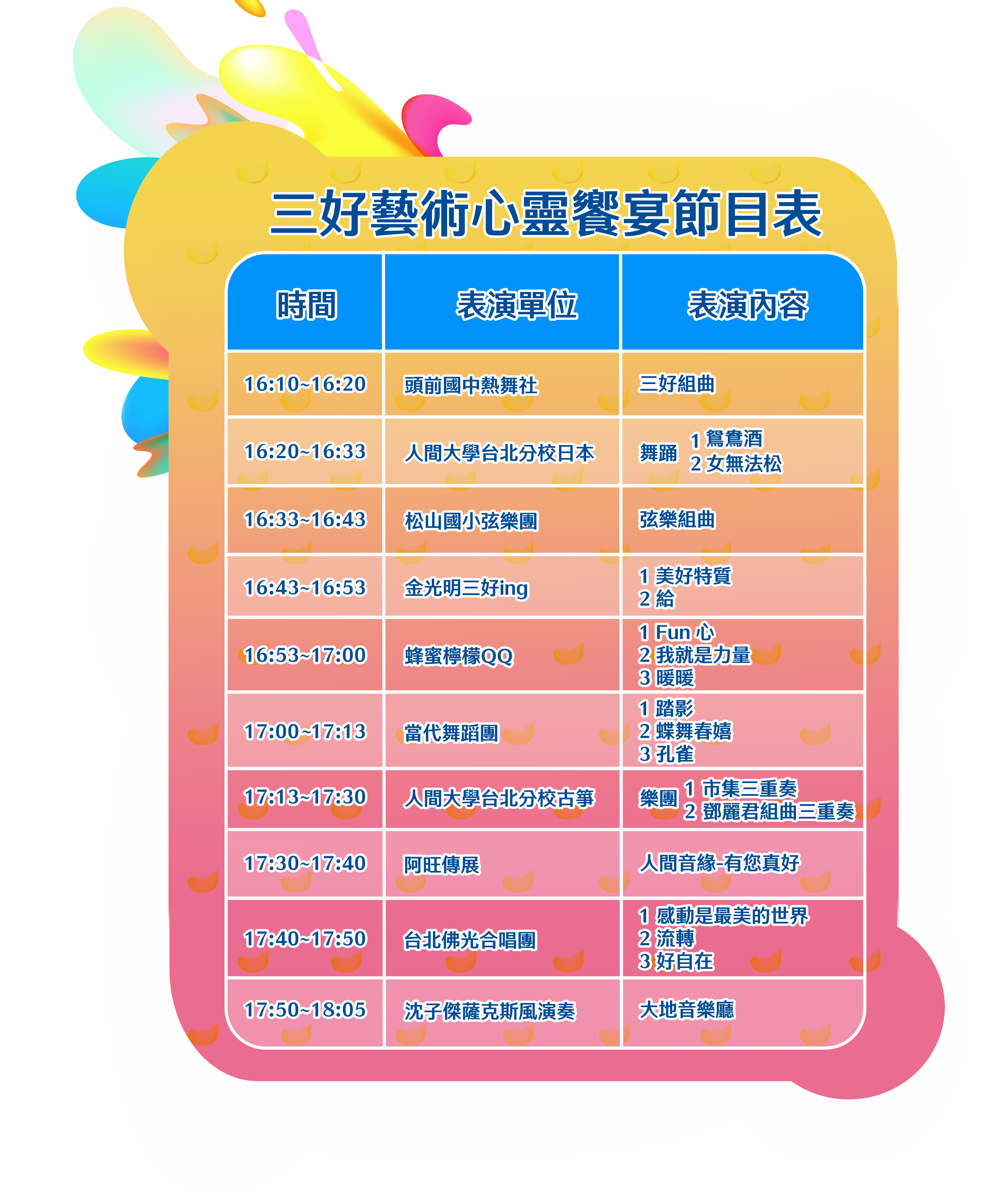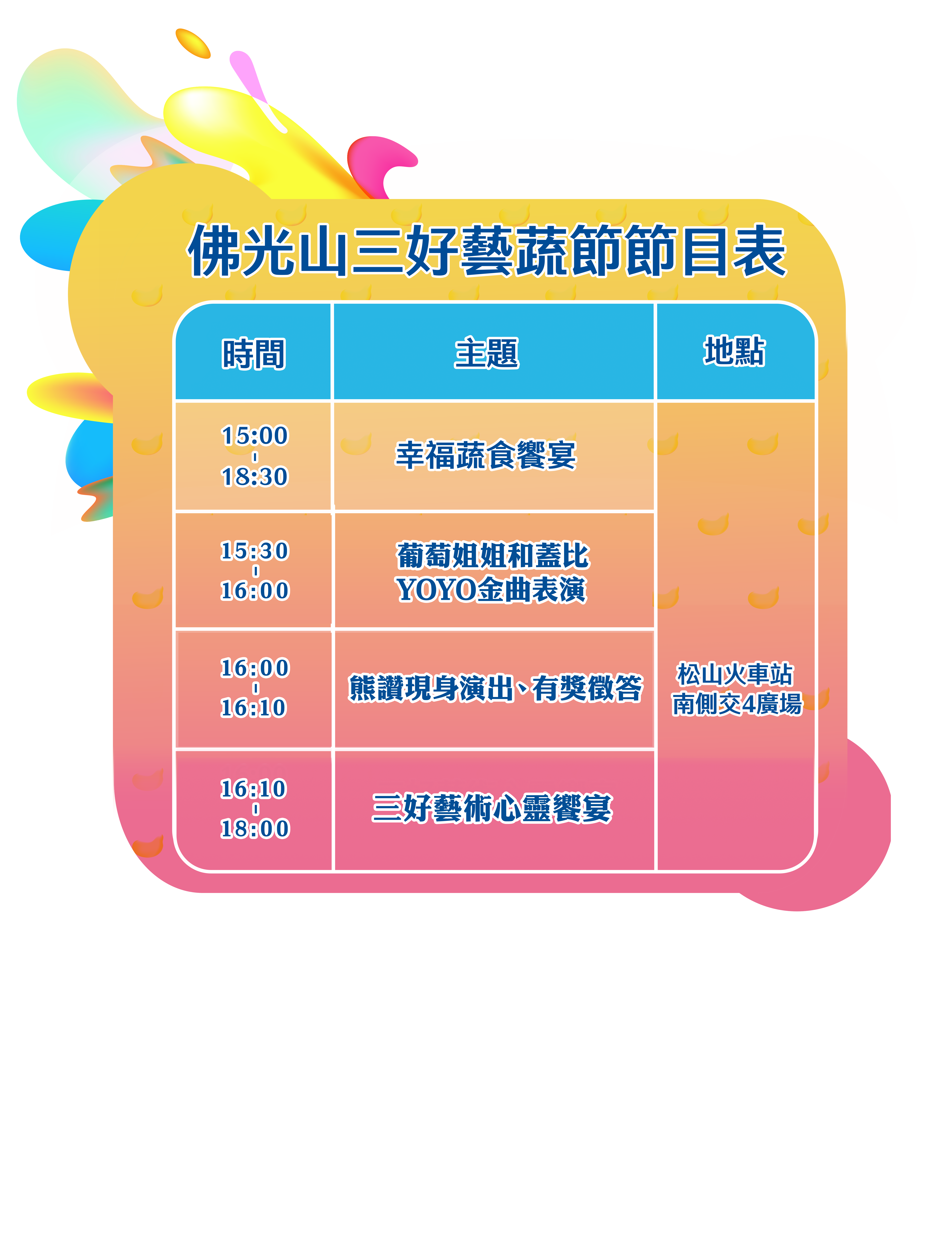 本週「佛光山三好藝蔬節」結合地方特色於交四廣場,邀請當地宗教團體-佛光山台北道場共襄盛舉,傳遞「三好精神」,並結合三好藝術心靈饗宴以及幸福藝蔬市集,推廣蔬食、環保的理念。更安排YOYO藝人葡萄姐姐與人偶蓋比歌舞唱跳,佛光山台北道場也將一同帶來豐富多元的表演節目。